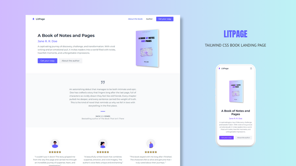 LitPage is a clean, responsive and easy to customize landing page built with Tailwind CSS and Tailblocks, made for authors and publishers who want to showcase their book in minutes.